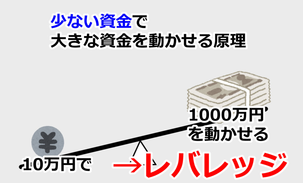レバレッジは別称「てこの原理」で、証拠金10万円で1000万円分の取引をするときは「レバレッジ100倍」になります。