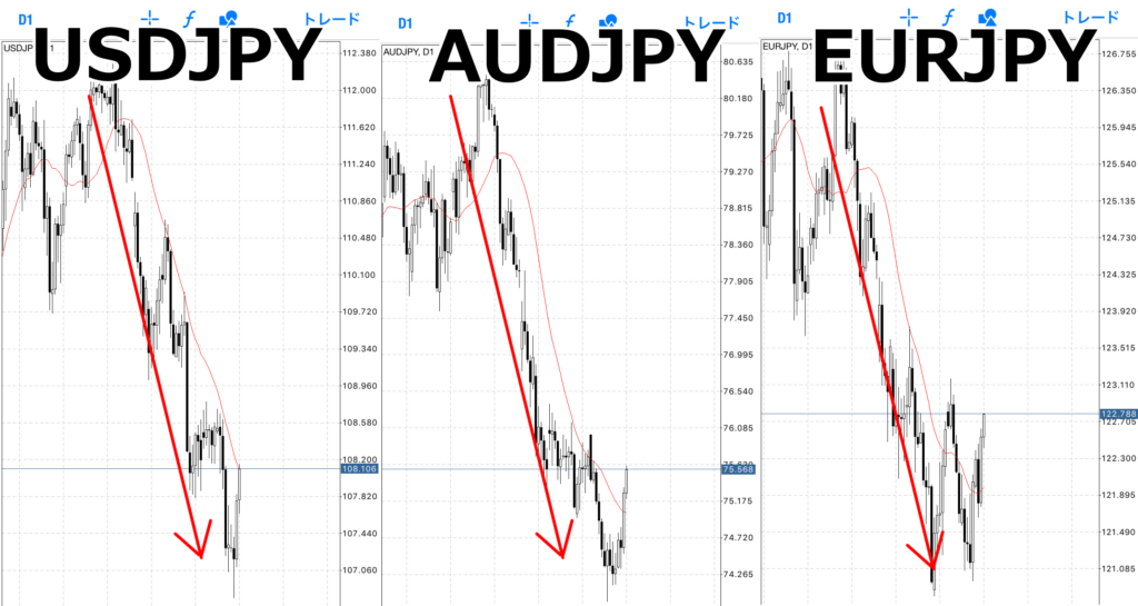 実際にチャートを見てみましょう。USDJPY,、AUDJPY、EURJPYのチャートになります。