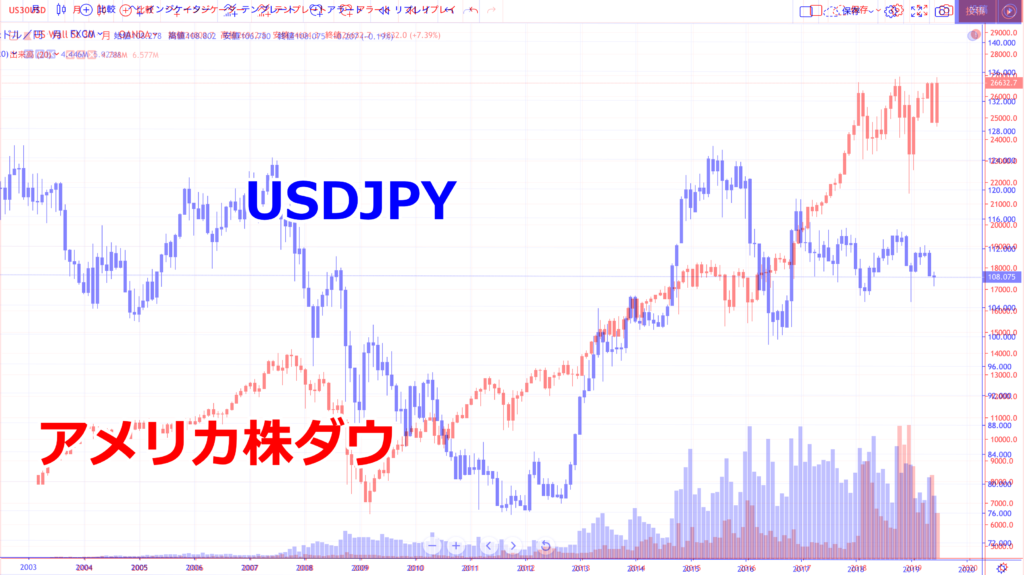 順相関でも短期的に見れば一時的に連動しないことはあります。しかし長期的に見ると、株価と円はしっかり順相関してます!