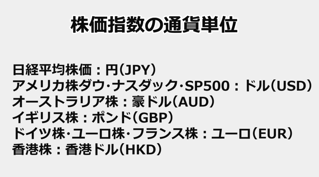 その通りです!下に主な株価指数の通貨単位をまとめておきます。