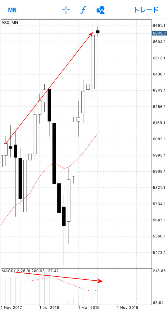 実はオーストラリア株で、月足でMACDを見ると、ダイバージェンスが出てたんですよ!