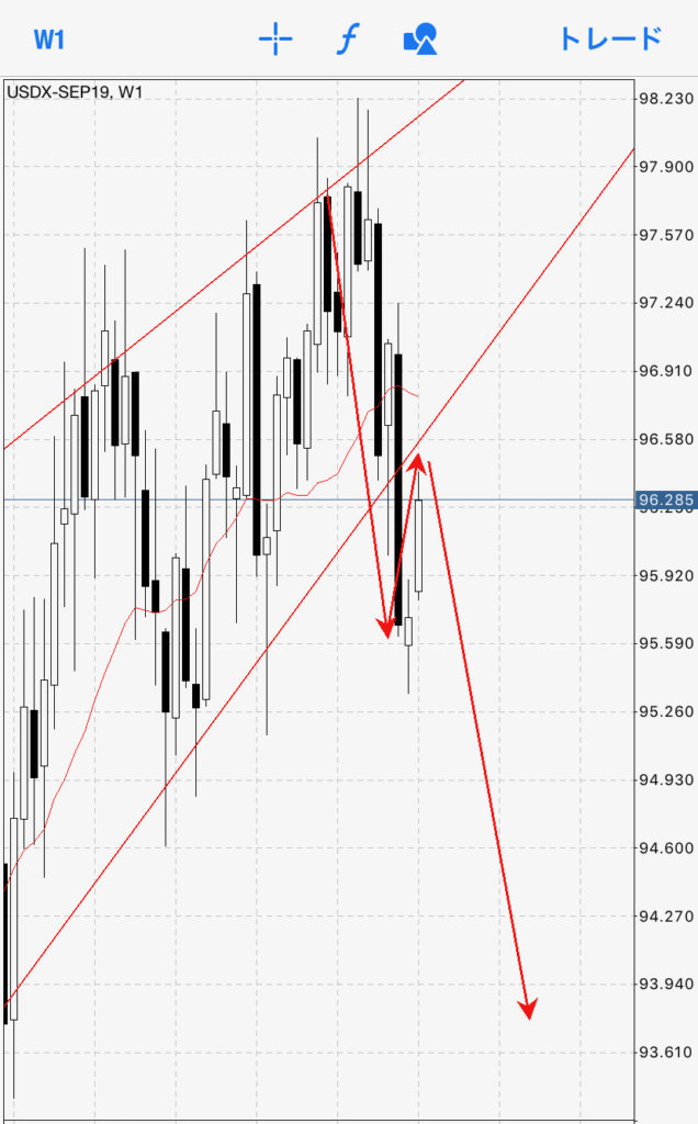 なるほど!それでよく見たら、トレンドラインを下に突き抜けてますね。