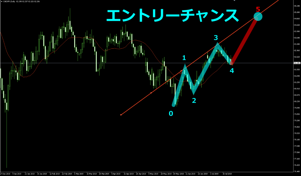 現在エリオット波動でいうと4波目なので、5波目の終点とトレンドラインがぶつかった辺りで見ていくといいですね!