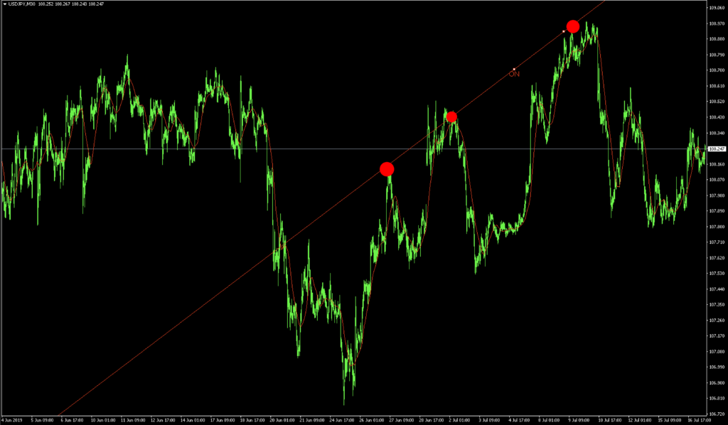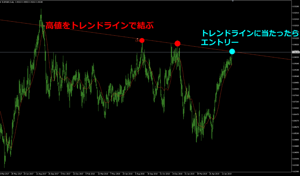 ライントレードとは、簡単に言うと安値か高値を目安にトレンドラインを引いて、そのトレンドラインに当たったらエントリーするという手法です。