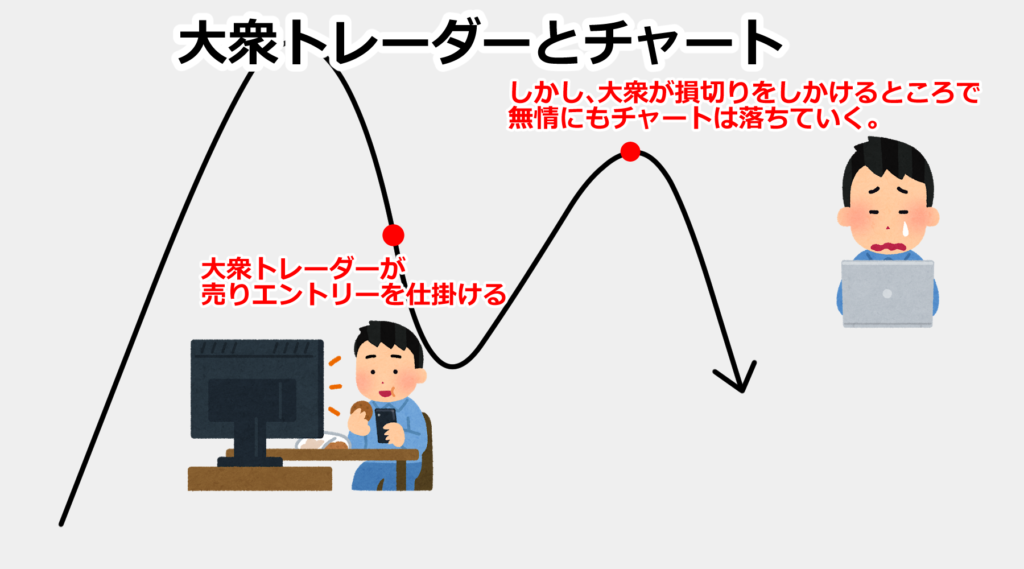 そして売りポジションを損切りする大衆トレーダーが増えると、無情にもチャートは落ちていきます。