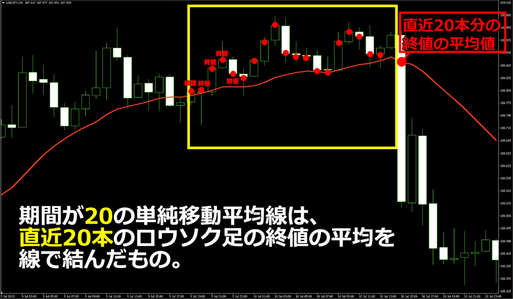 単純移動平均線は、現在のロウソク足より前の、指定したロウソク足の数の「終値」の平均価格を線で結んだものになります。