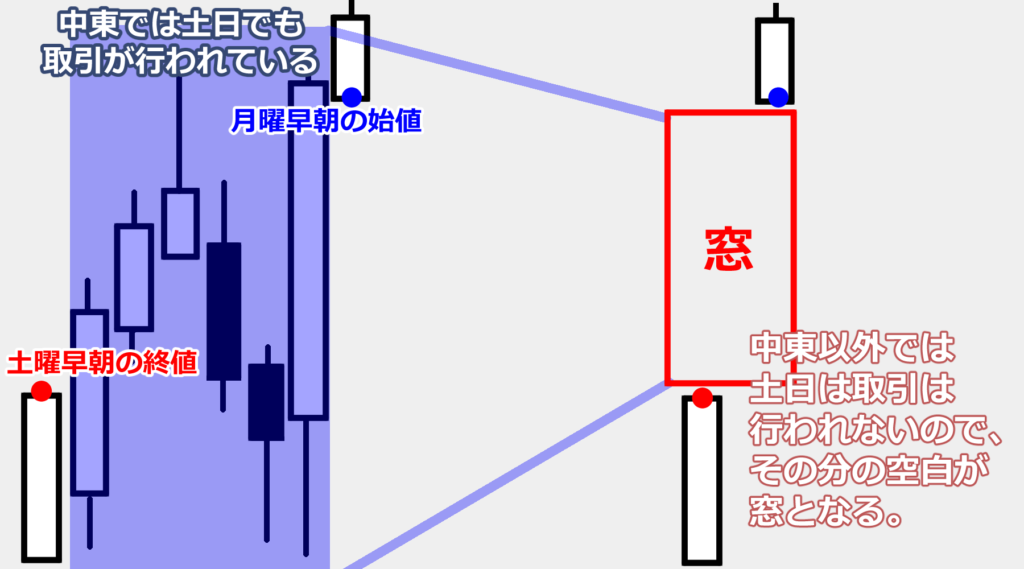 なので、バーレーン市場で取引された分が中東以外では土日のチャートが表示されないので、表示されなかった空白部分が「窓」となるんです!