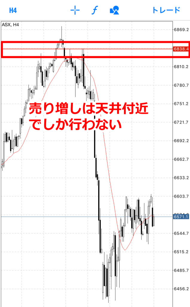天井からエントリーすることで、損切り幅を小さくできます。だからオーストラリア株の売り増しも、以下のように天井付近でしかしてないんです。