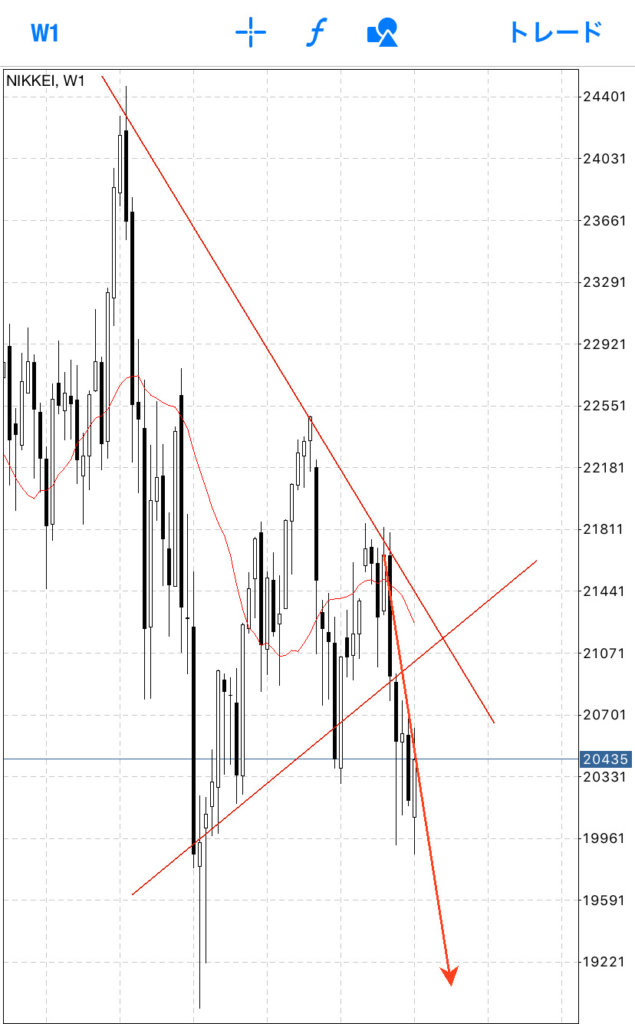 更に日経平均株価もドル円と同じく三角持ち合いになっているので、ドル円と同時に下抜けしていく可能性があります。