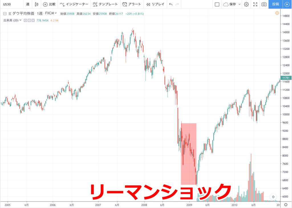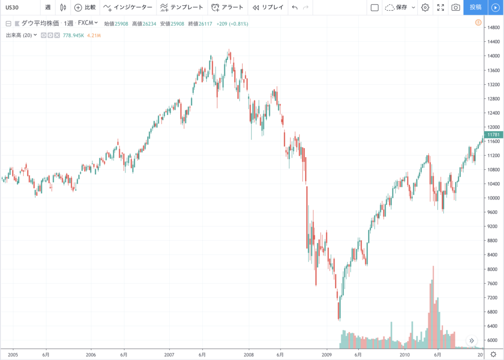2008年リーマンショック時のアメリカ株ダウのチャートがわかりやすいですね!
