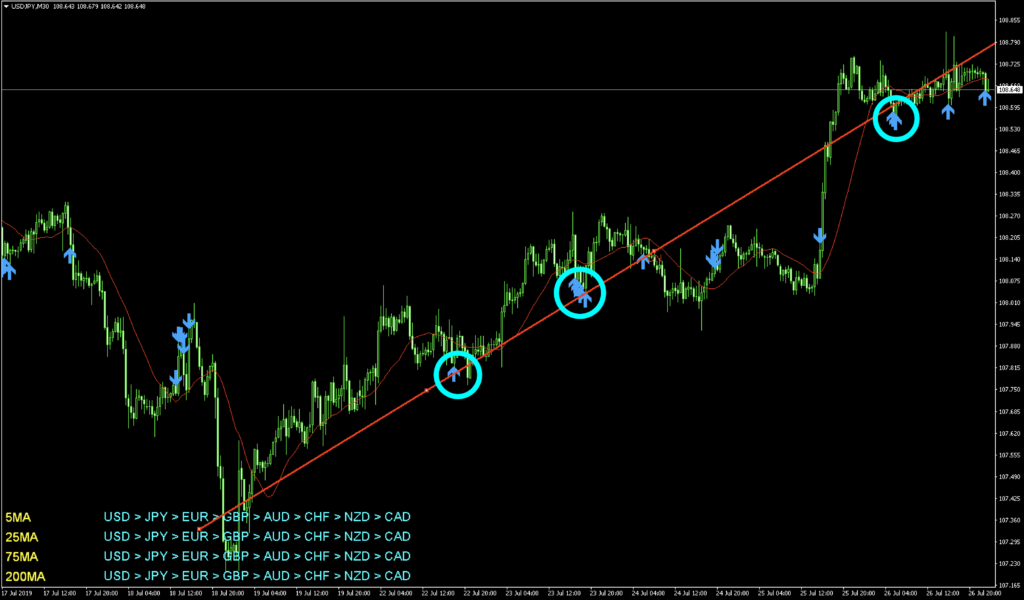 グランビル4番は右肩上がりの移動平均線に沿って価格帯が上昇していく中、