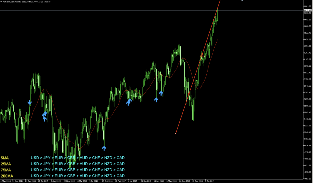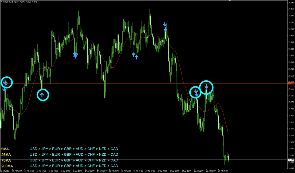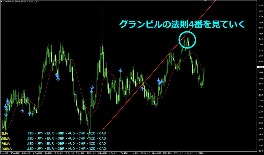 下はEURAUDのチャートになりますが、実はグランビルの法則4番を見ていきます。