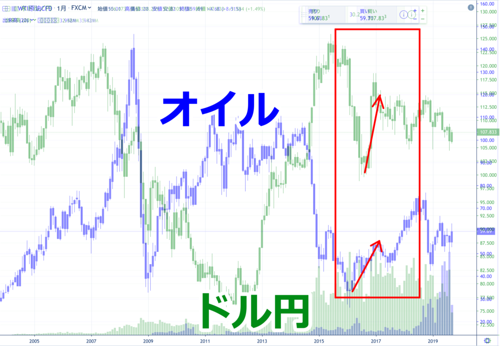実際に2015年に25バレルの最安値をつけました。そこからオイルは上昇しましたが、ドル円も上昇していますよね?