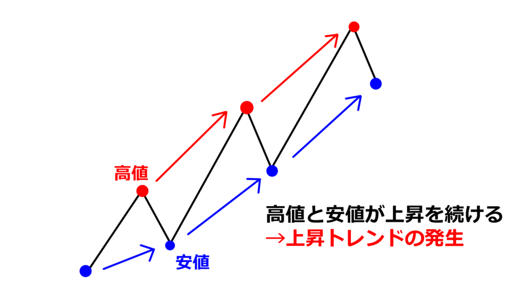 下記の図のように、チャートが高値も上昇、安値も上昇していると見ます。