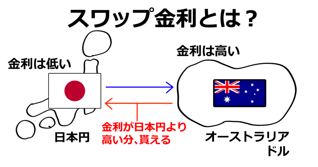 AUD(豪ドル)の方が日本円に比べて金利が高いため、AUDJPY(豪ドル円)を買うとその分金利差をもらうことができます。