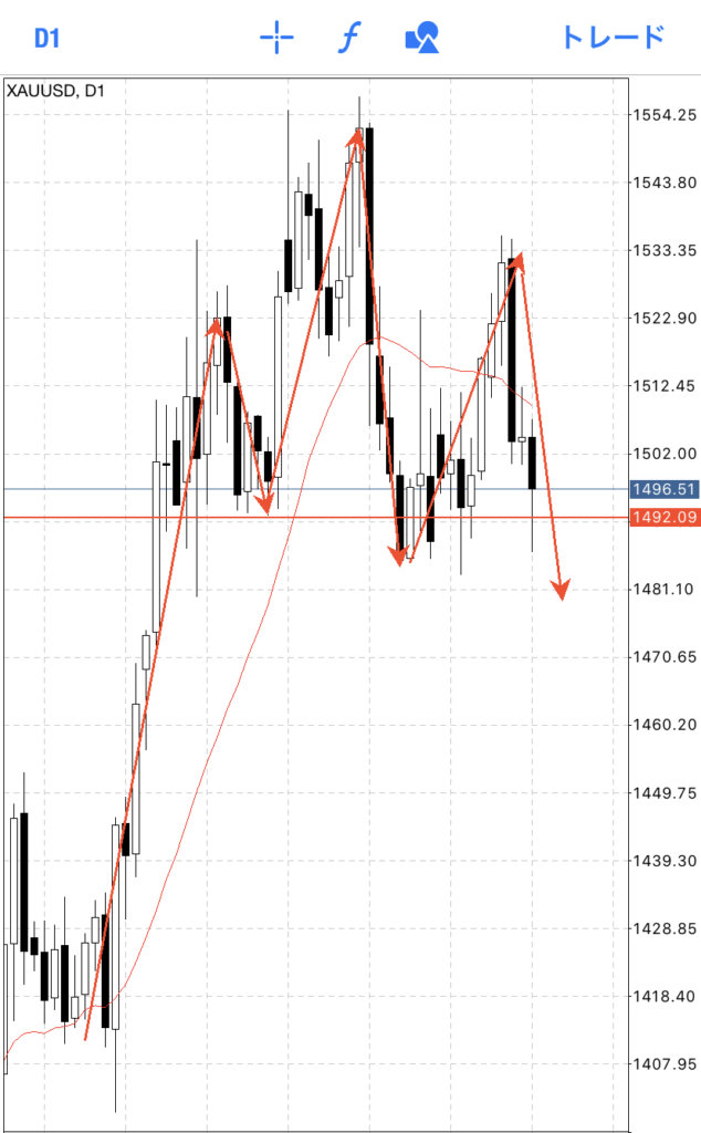 あ、つまり金チャートでヘッド・アンド・ショルダーの右肩が出現しているから、ネックラインを超えれば暴落する可能性がある・・・・ということなんですね?
