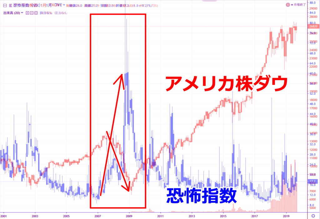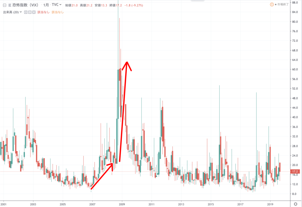 ここで言いたかったのは、実は今の恐怖指数の動きがリーマンショック直前の動きと似ているということなんです。