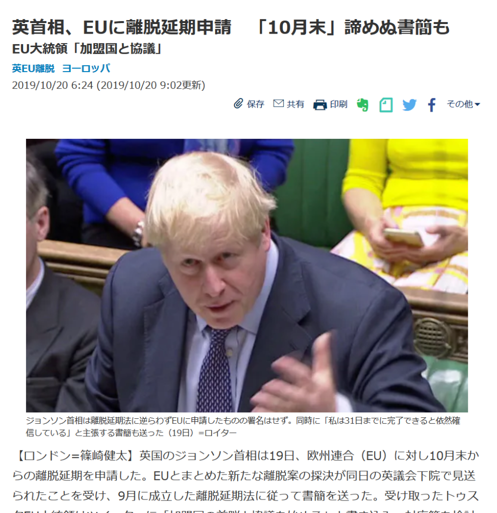 日本経済新聞『英首相、EUに離脱延期申請「10月末」諦めぬ書簡も』より引用