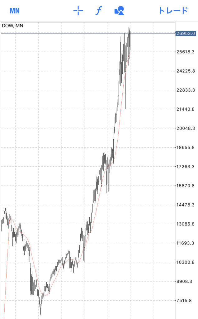 実はアメリカ株ダウを見たとき、グランビルの法則4番で月足でそこまで移動平均線から離れていなかったんです。