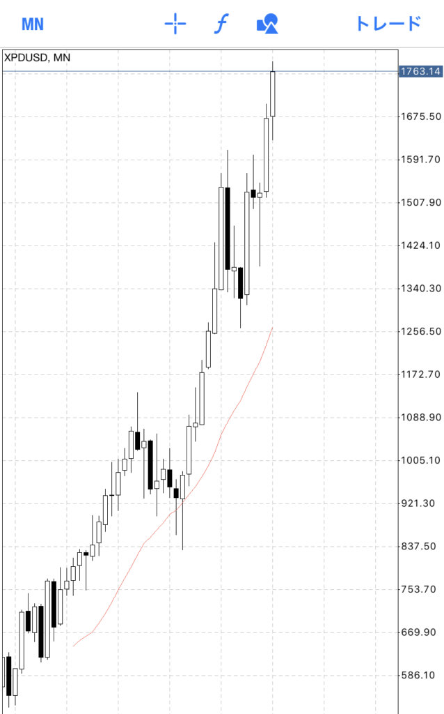 しかし、パラジウムの方は月足で明確なグランビルの法則4番で移動平均線から乖離しています。