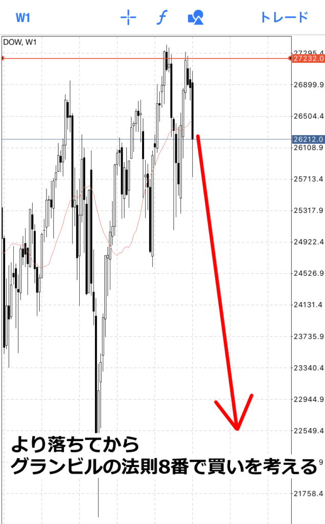 僕は今から買いで入るとは考えませんね。より落ちたところでグランビルの法則8番で考えていきますね。