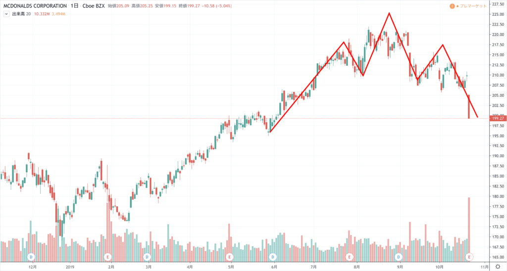 更にマクドナルド株はヘッド・アンド・ショルダーが出現しており、形通りに暴落しました。