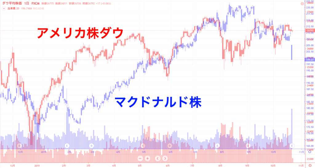 つまり、アメリカ株ダウの動きはマクドナルド株に連動する傾向があるわけです。