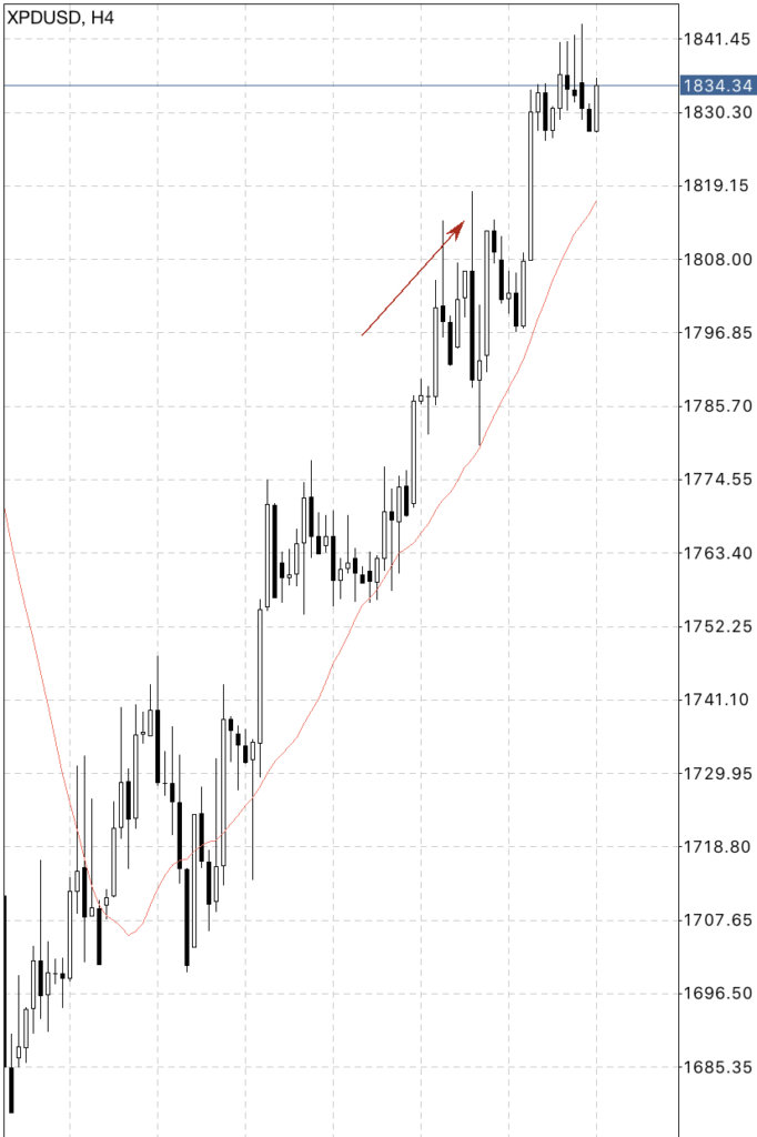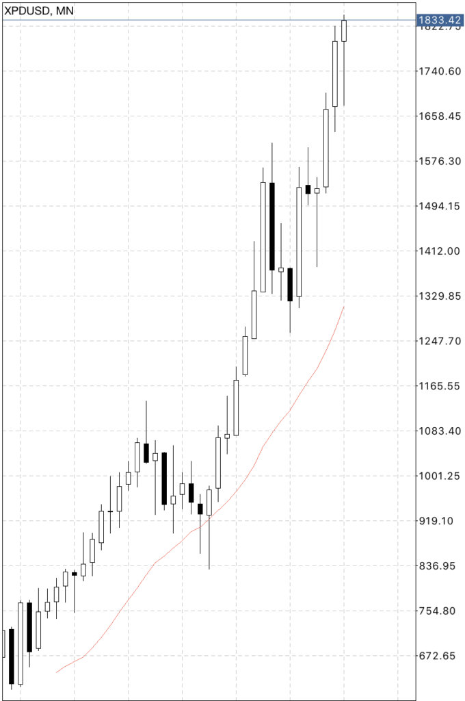 最高値を更新しましたが、パラジウムが月足で移動平均線からより離れたということは、それだけ期待値も大きくなったと言えます。