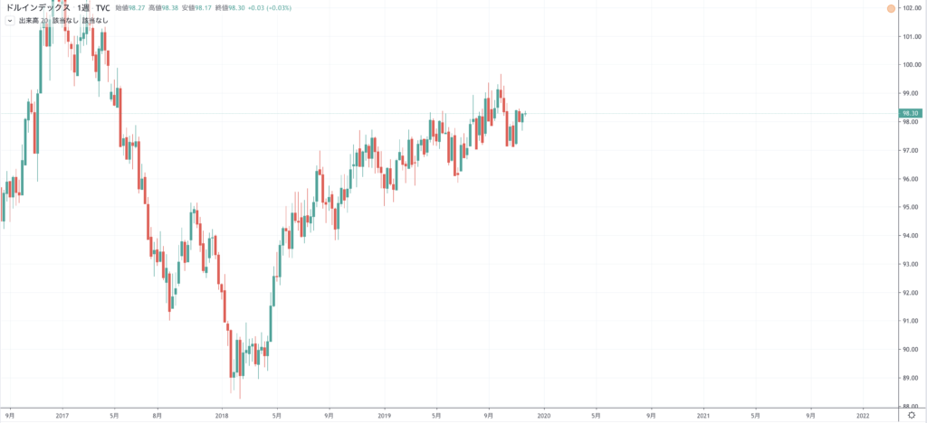 ドルインデックスは、他の通貨と比べてどのくらい相対的にドルの価値があるのか、という指標になります。