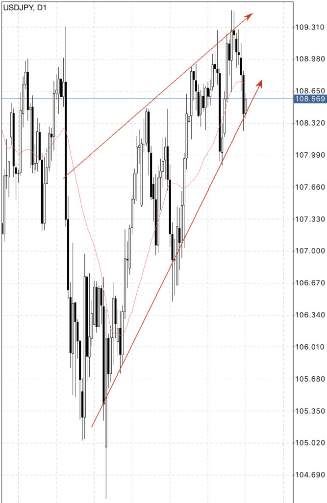 さて、ドル円はトレンドの終焉に見られる「トレンドラインが収束するパターン」になっています。