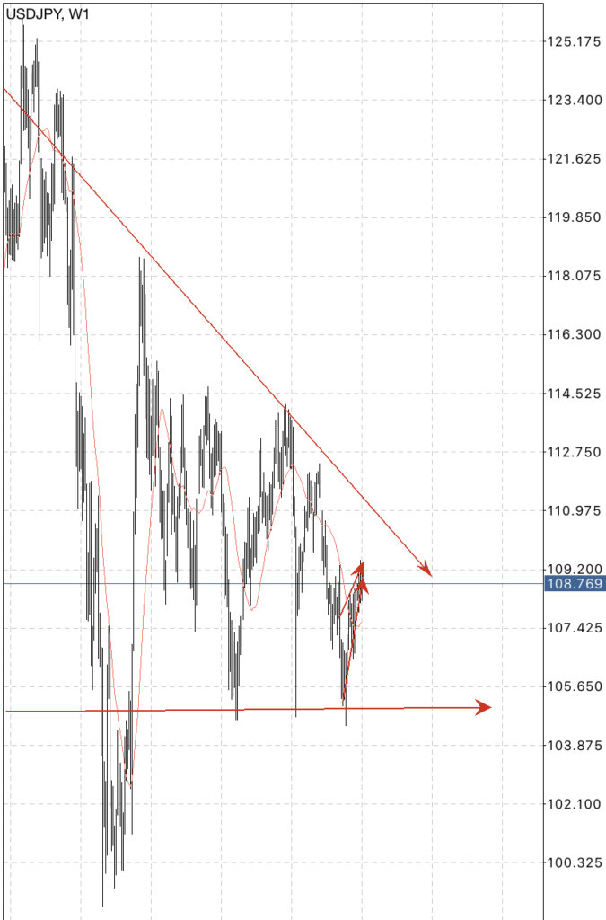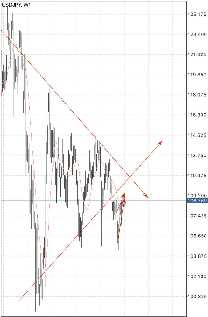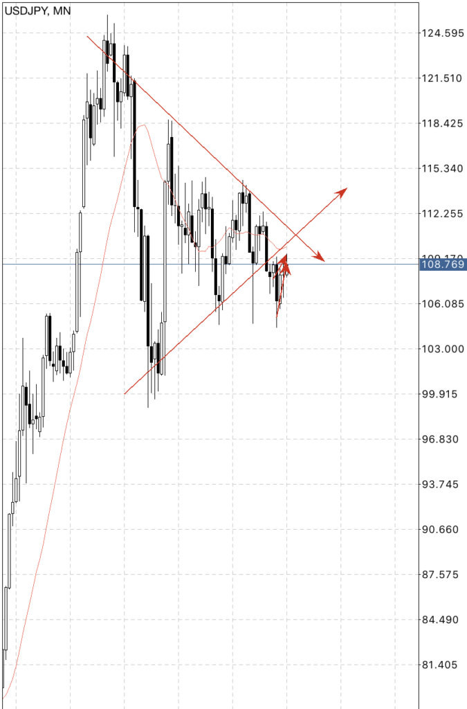 ドル円は月足だとこのように三角持ち合いで見ています。