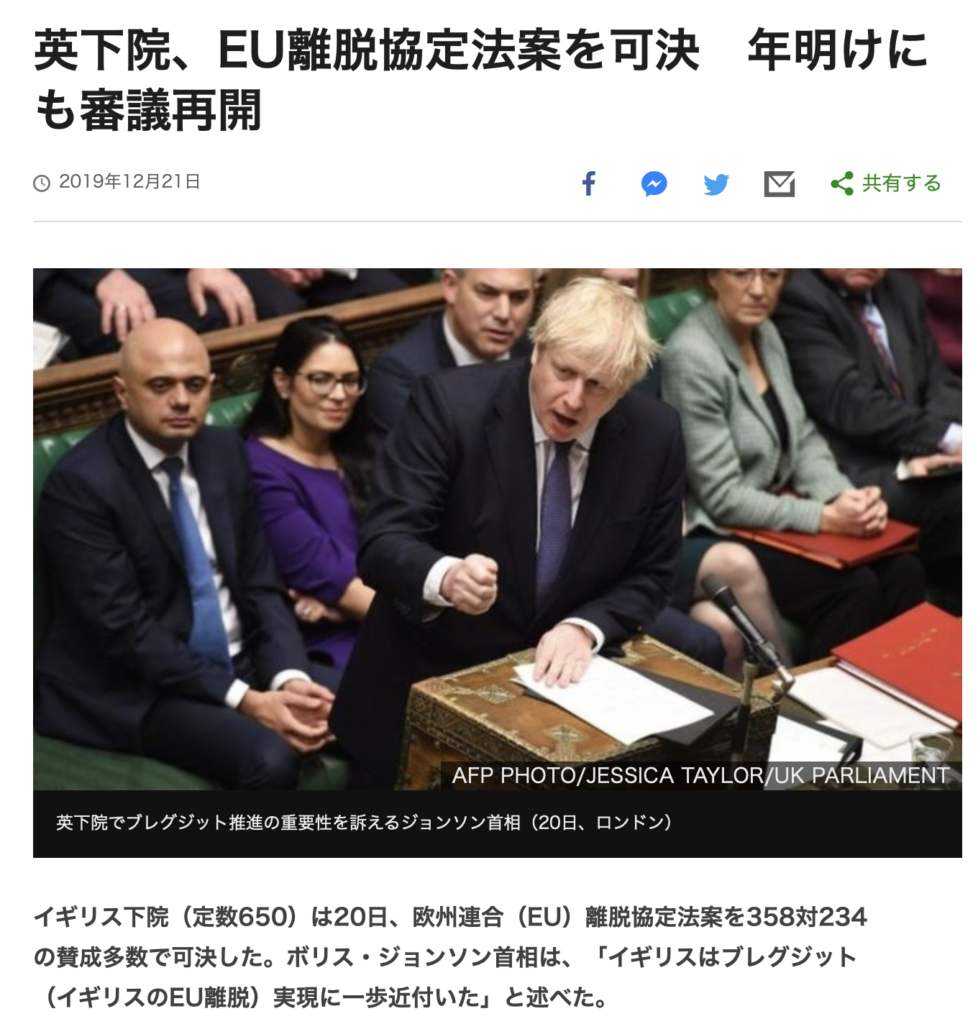 BBCニュース『英下院、EU離脱協定法案を可決 年明けにも審議再開』より引用