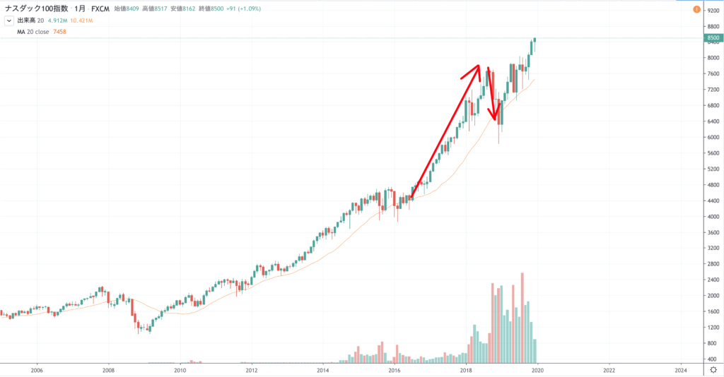 2018年にアメリカ株ナスダックで月足グランビルの法則4番が出たとき、見事に転換して6700万円獲得しました!