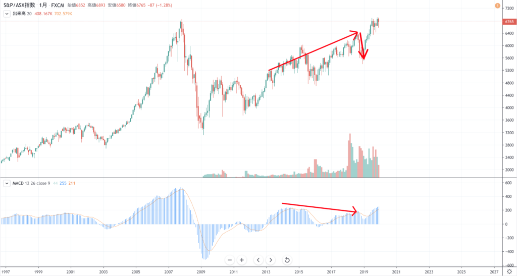 実際にオーストラリア株の月足でダイバージェンスが出現して、見事に落ちて一撃1億円を達成しました。