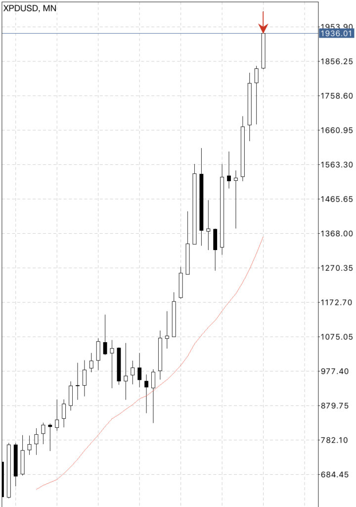 パラジウムは月足でもかなり移動平均線から離れてて、見事に効いてきてます。