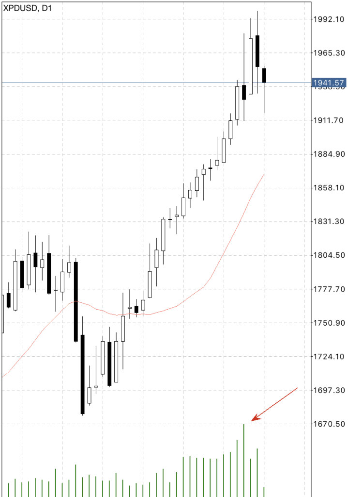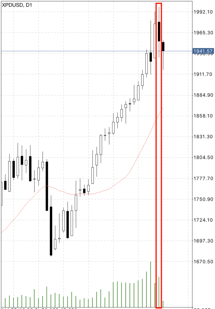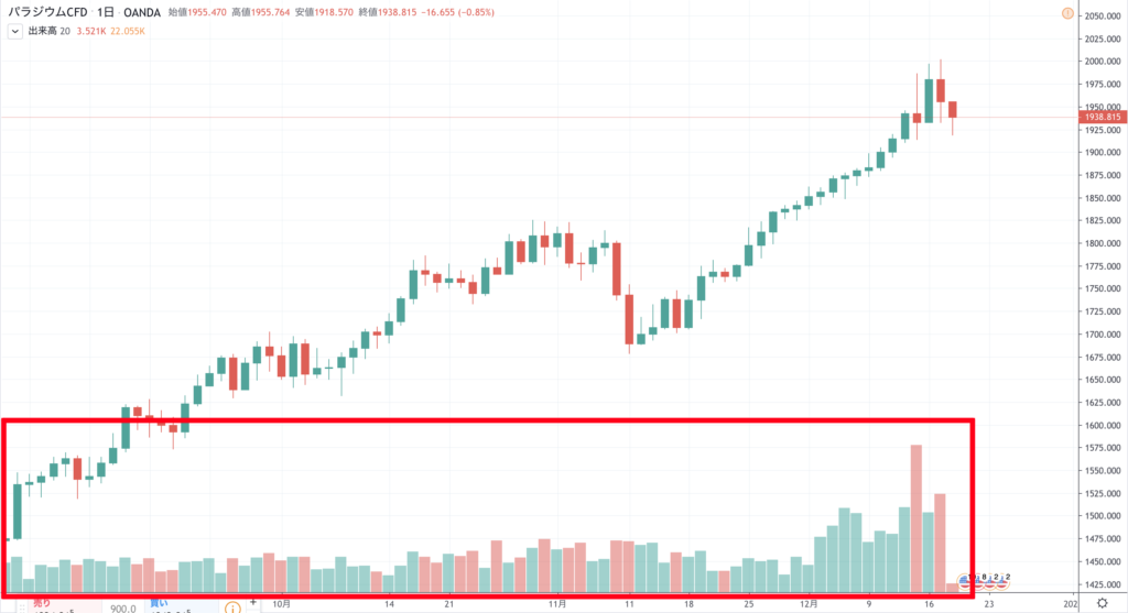 さて、パラジウムの日足で注目してほしいのが、12/13は陰線なのに出来高が異常なぐらい上昇しています。