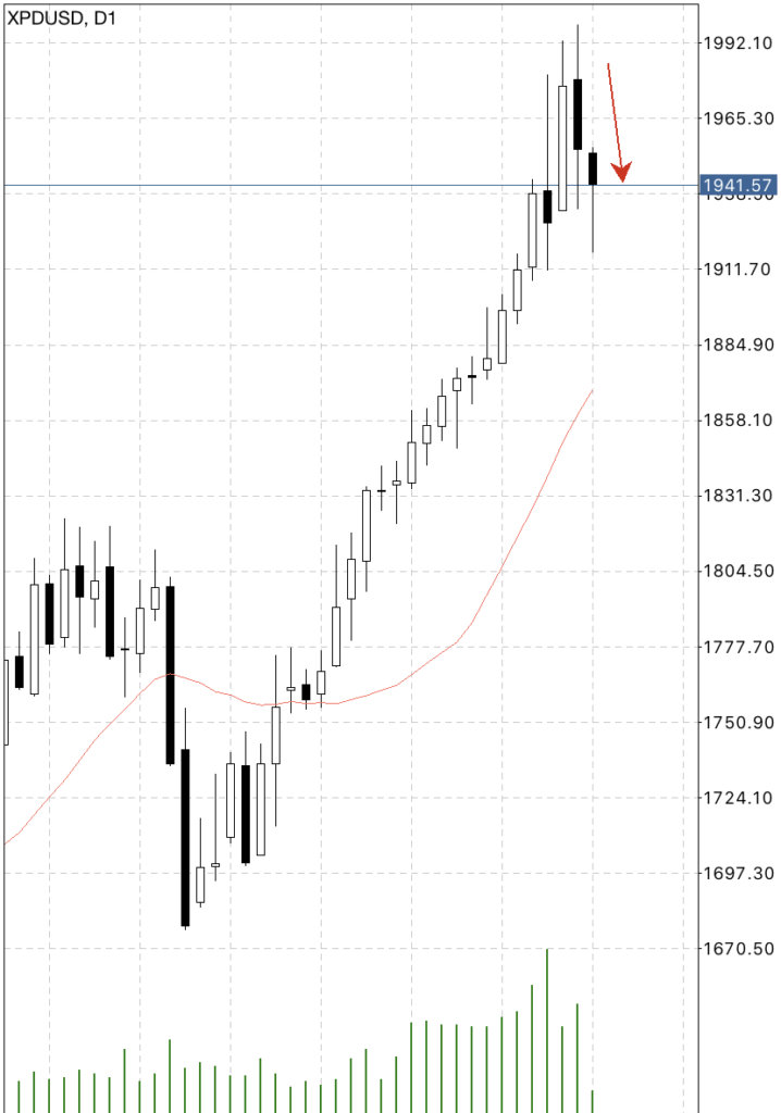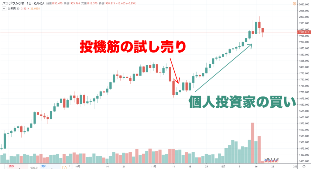 パラジウムの場合、投機筋が売りを仕掛けて陰線をつけ、個人投資家が買って陽線をつける感じですね。