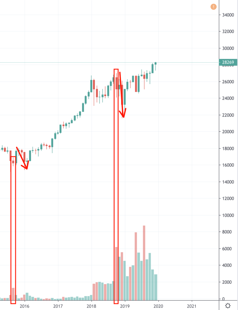 アメリカ株ダウでは実際に2回陰線つけて出来高が一気に上昇してから、トレンド転換してました。