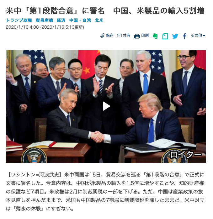 日本時間で1月16日未明、アメリカ・中国間は第1段階合意に署名し、ひとまず2018年から始まった米中貿易戦争は落ち着きました。