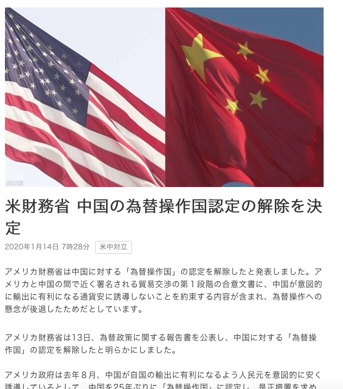 NHK NEWS WEB 『米財務省 中国の為替操作国認定の解除を決定』より引用