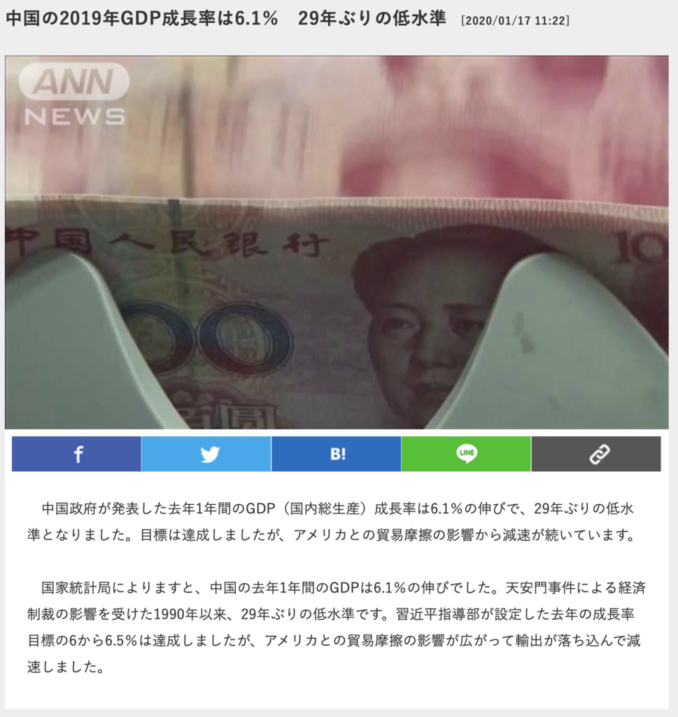テレ朝news 『中国の2019年GDP成長率は6.1% 29年ぶりの低水準』 より引用