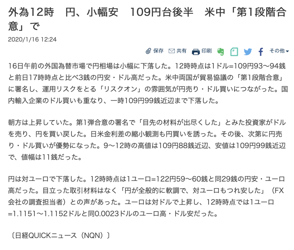 日本経済新聞 『外為12時 円、小幅安 109円台後半 米中「第1段階合意」で 』 より引用