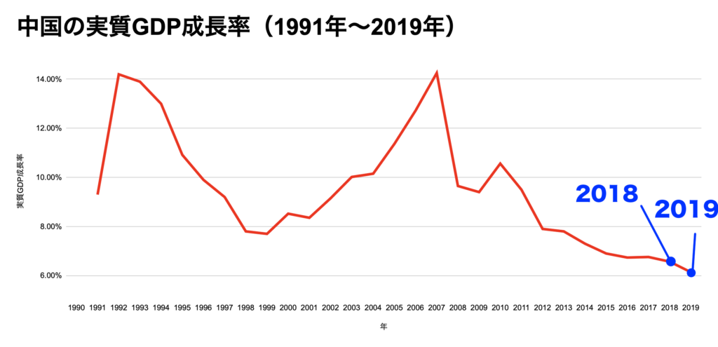 そうですね。特に注目してほしいのは、2018年の米中貿易戦争が始まったときから成長率減少が加速しているところです。