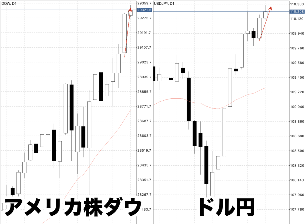 実際に第1段階合意後、アメリカ株ダウとドル円も上昇しました。