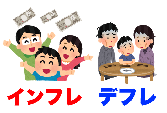 反対に、デフレになると、モノは安くなりますが世間に出回るお金の量も少なくなるので不景気になるんです!