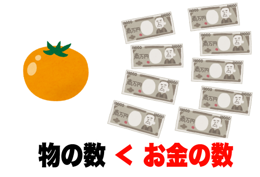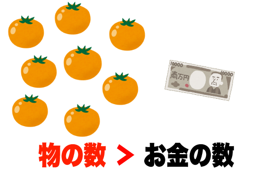 逆に、お金よりもモノの数が多くなってしまった状態、つまり、お金がモノよりも高くなった状態をデフレと呼びます。