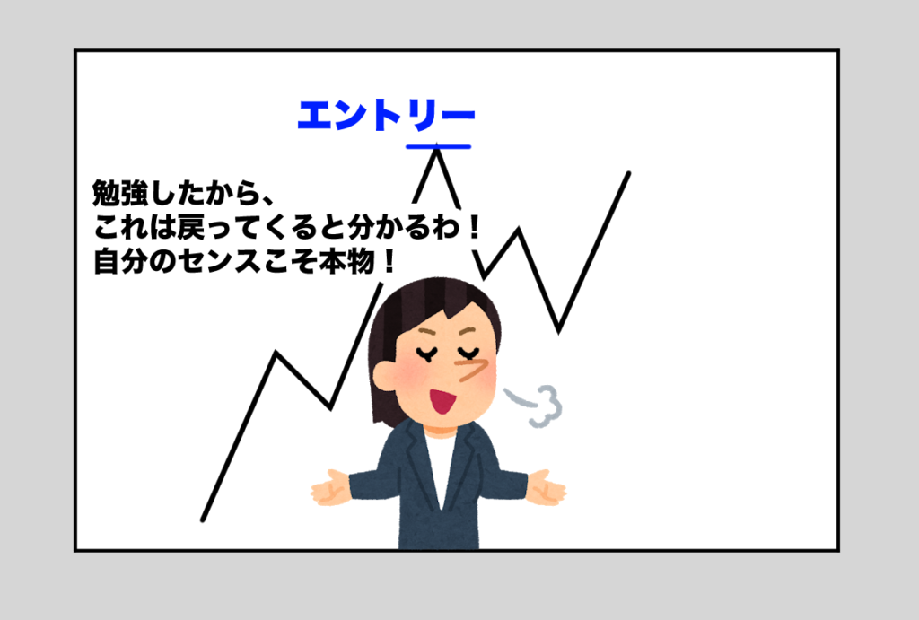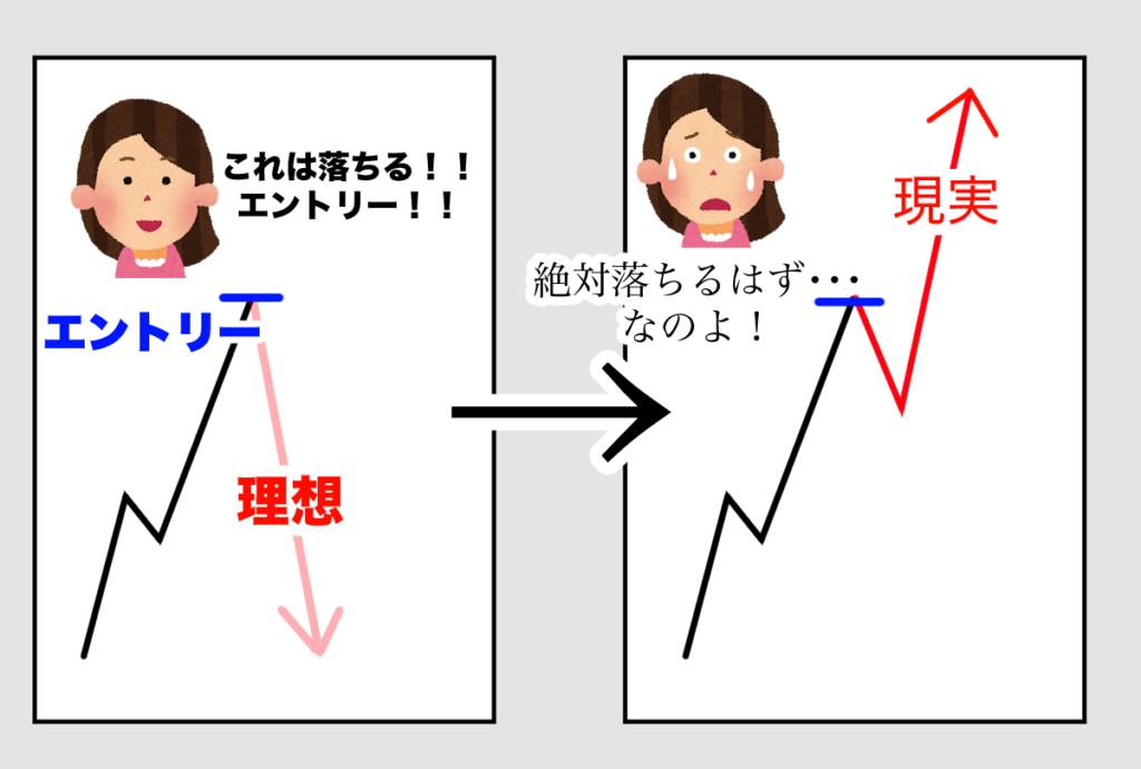 確かに、エントリーした後にチャートが逆に動いた後も「そんなはずはない!私の理論は絶対正解なはず!」と思い込んで臨機応変になれませんでした。