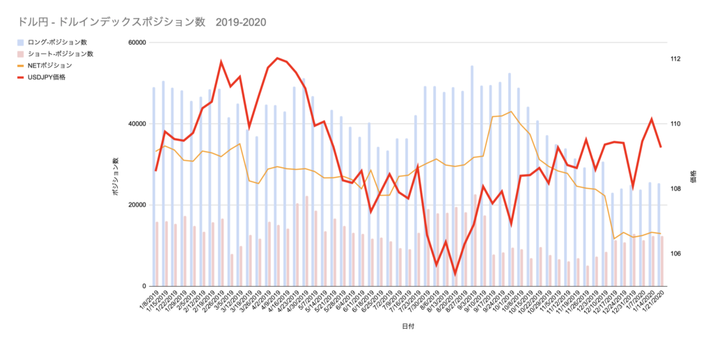 さて、こちらがドル円のチャートに、ドルインデックスのポジション数(投機筋)を合わせた画像になります。