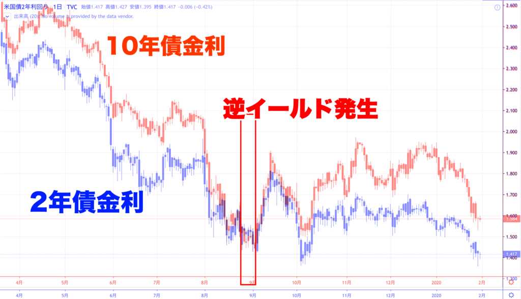 そして2019年8月には2年債金利も10年債金利を上回って、逆イールドを起こしていました。