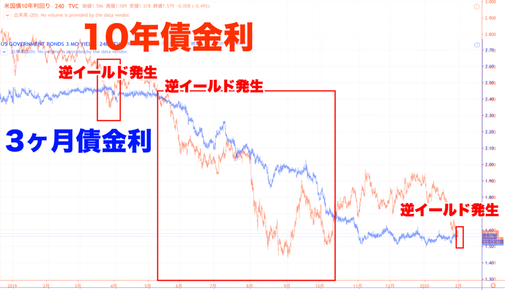 ・3回目:3ヶ月債金利が10年債金利を上回る。(2020年1月)